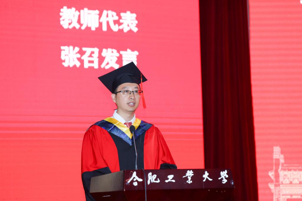 教师代表张召教授叮嘱大家要树立目标,做一个对社会有用的人;要踏实做事,做一位有事业心和责任感的人;要锤炼自己,做一位能力出众和身心健康的人;要常怀感恩之心,常为感恩之行,做一位懂得回馈社会的人。