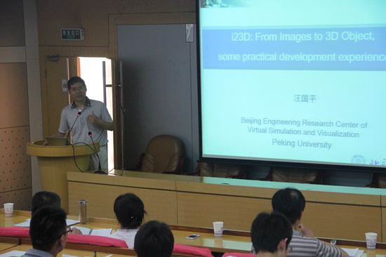 三维重建是计算机视觉与计算机图形学领域一个重要的且富有挑战性的研究课题。在报告中,汪建国教授首先介绍了实验室的总体研究工作,以及实验室开发的各项系统。随后,汪建国教授结合实验室自主开发的三维重建系统i23D(from image to 3D object),详细介绍了从照片序列到三维模型的整个重建过程。包括采用多标定板和无标定板进行三维重建的优化计算方法以及三维网格和纹理重建过程中的关键技术。汪教授的报告引起了在座师生的浓厚兴趣。报告会后,参会师生分别就自己感兴趣的问题与汪教授进行了交流互动。